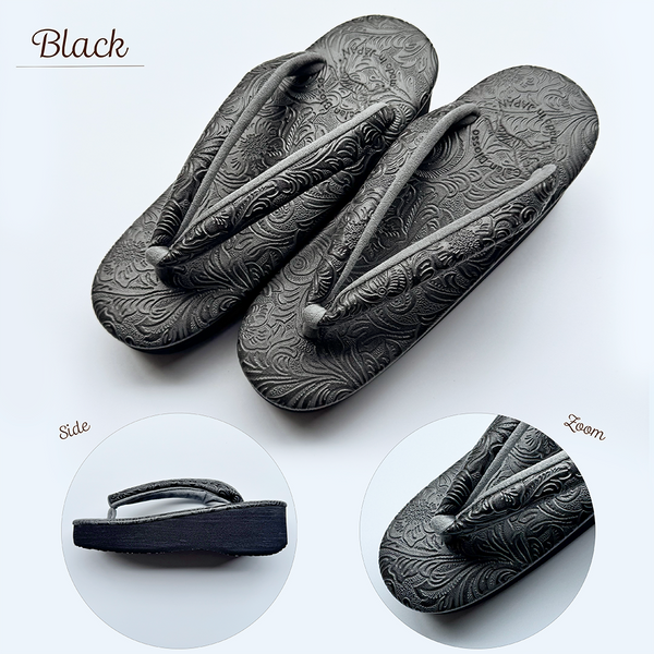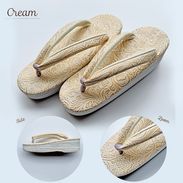 豪華な唐草模様の型押し生地がさりげなく華やかさを演出し、おでかけ着の足元を上品に彩ります。